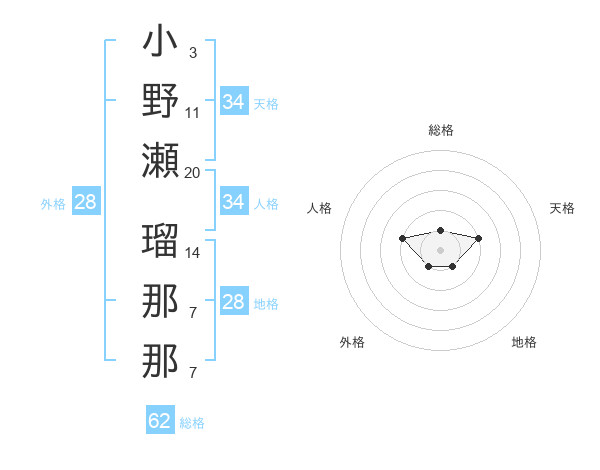 小野瀬 瑠那那さんの天格は34画の2点!