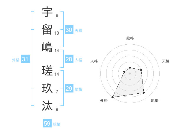 宇留嶋 瑳玖汰さんの総格は59画の1点!