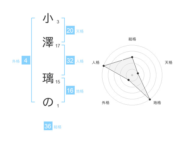 小澤 璃のさんの天格は20画の1点!