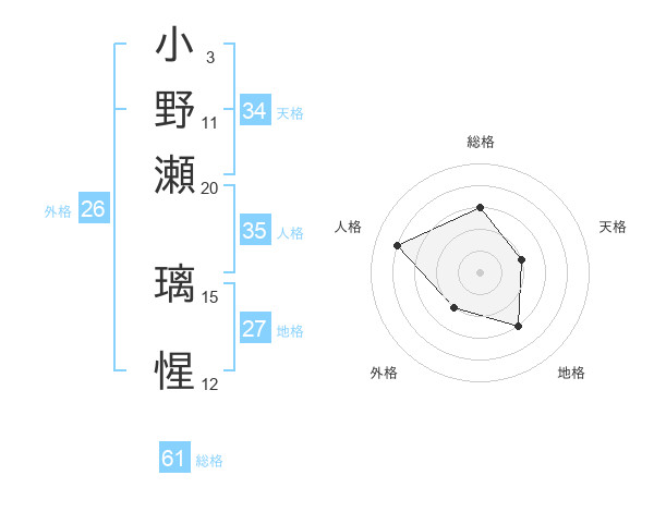 小野瀬 璃惺さんの総格は61画の3点!