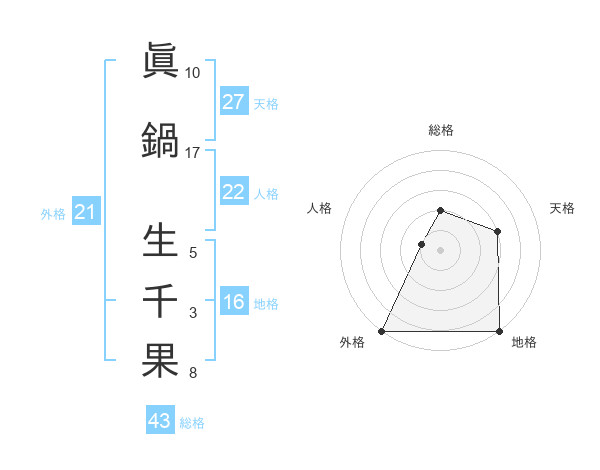 眞鍋 生千果さんを姓名の画数から五運を鑑定