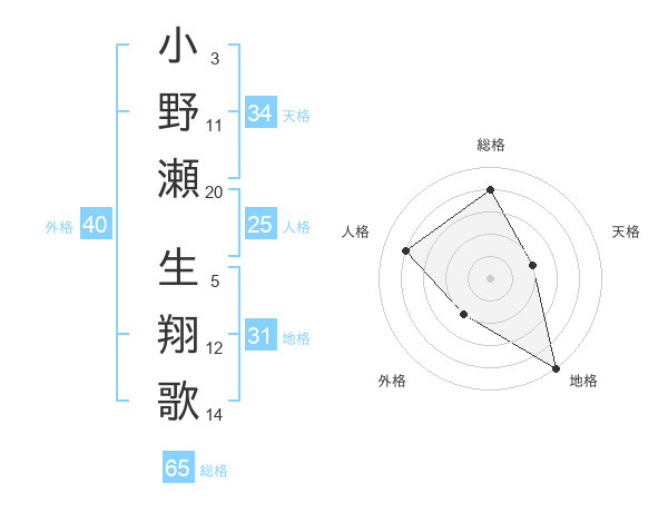 小野瀬 生翔歌さんを姓名の画数から五運を鑑定