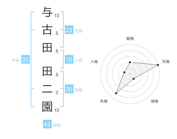 与古田 田二園さんを姓名の画数から五運を鑑定