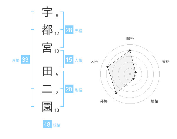 宇都宮 田二園さんを姓名の画数から五運を鑑定