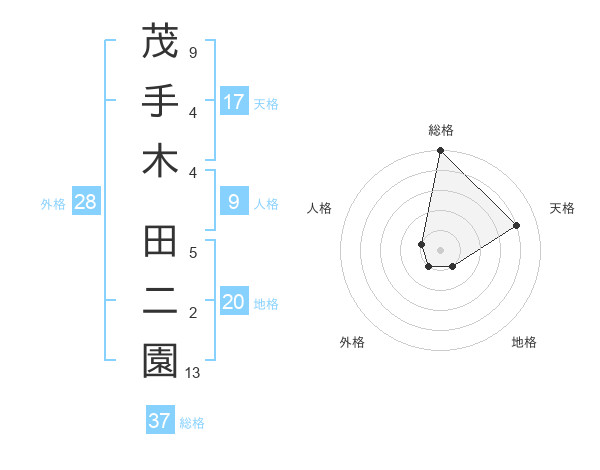 茂手木 田二園さんの総格は37画の5点!