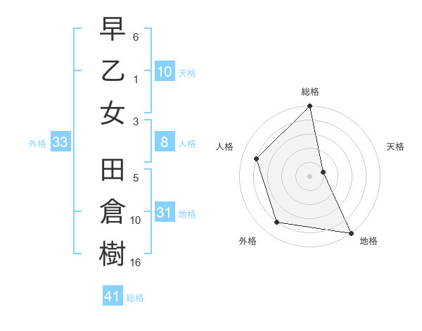 早乙女 田倉樹さんを姓名の画数から五運を鑑定