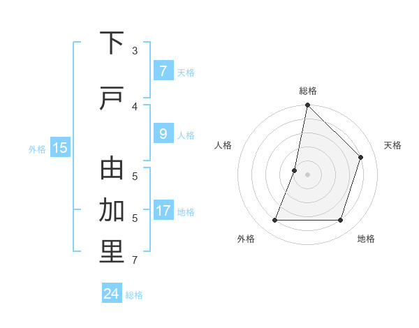 下戸 由加里さんの総格は24画の5点!
