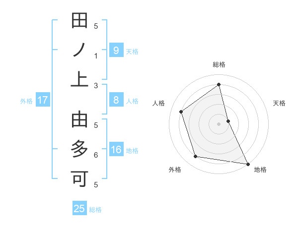 田ノ上 由多可さんを姓名の画数から五運を鑑定