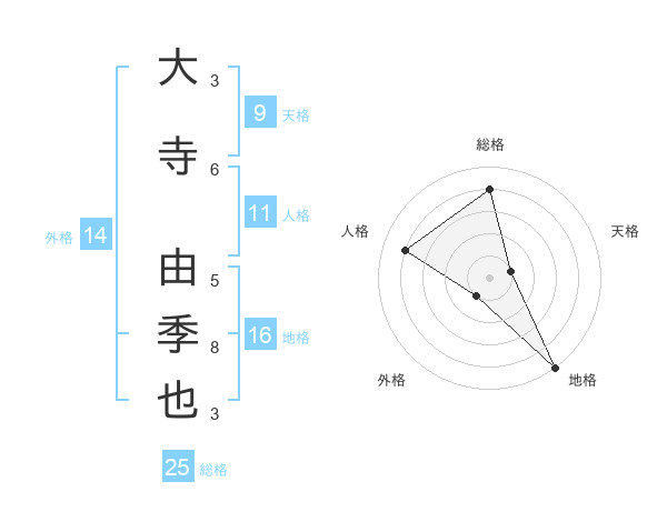 大寺 由季也さんの総格は25画の4点!