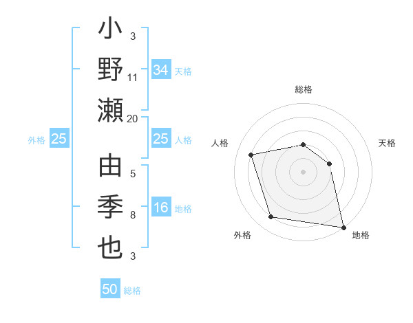 小野瀬 由季也さんを姓名の画数から五運を鑑定