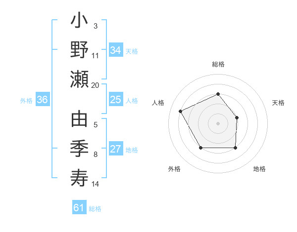 小野瀬 由季寿さんを姓名の画数から五運を鑑定