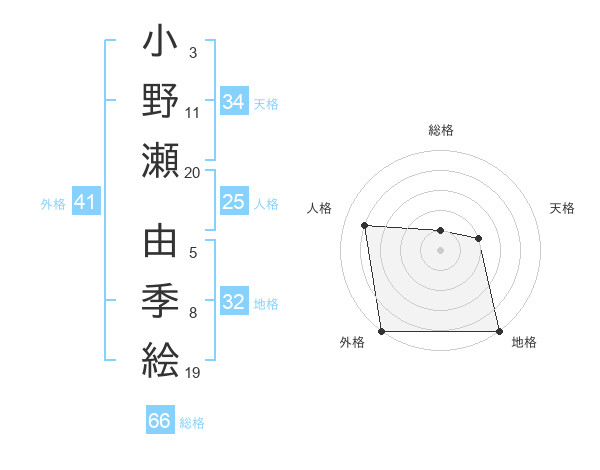 小野瀬 由季絵さんを姓名の画数から五運を鑑定