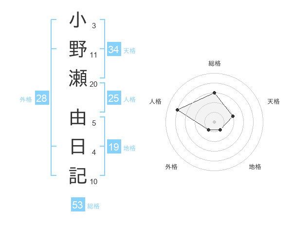 小野瀬 由日記さんを姓名の画数から五運を鑑定