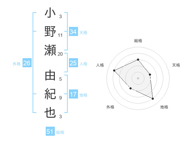 小野瀬 由紀也さんを姓名の画数から五運を鑑定