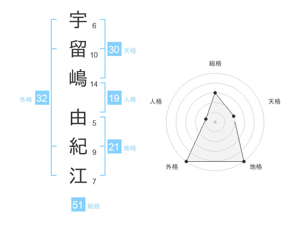 宇留嶋 由紀江さんを姓名の画数から五運を鑑定