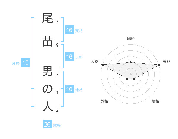 尾苗 男の人さんの天格は16画の5点!
