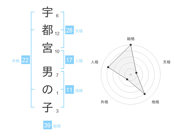 宇都宮 男の子さんの総格は39画の5点!
