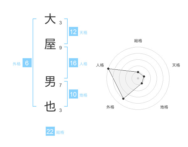 大屋 男也さんの総格は22画の1点