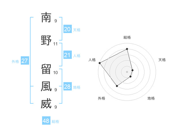 南野 留風威さんの総格は48画の4点