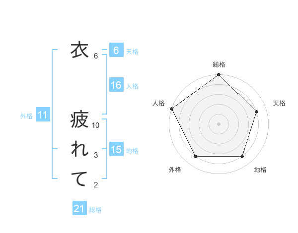 衣 疲れてさんの総格は21画の5点!