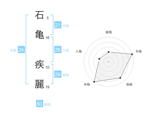 石亀 疾麗さんを姓名の画数から五運を鑑定