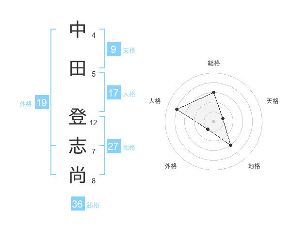 中田 登志尚さんの総格は36画の3点