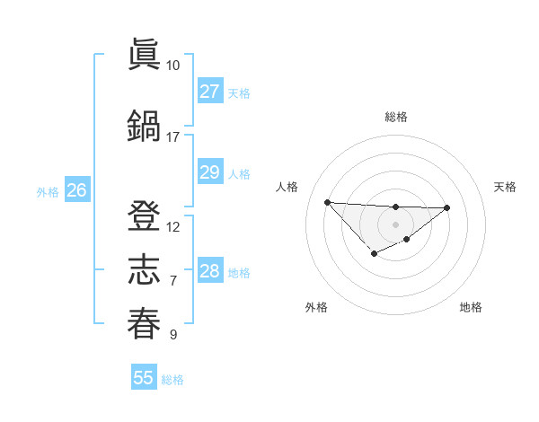 眞鍋 登志春さんを姓名の画数から五運を鑑定