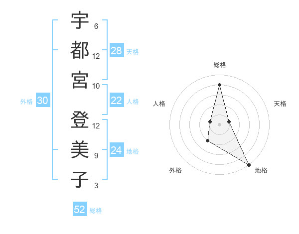 宇都宮 登美子さんを姓名の画数から五運を鑑定