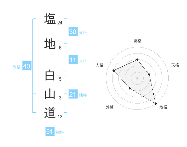 塩地 白山道さんの総格は51画の3点!
