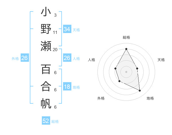 小野瀬 百合帆さんの総格は52画の4点!