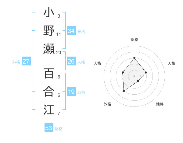 小野瀬 百合江さんを姓名の画数から五運を鑑定