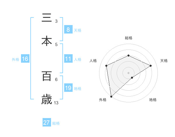 三本 百歳さんの外格は16画の5点!