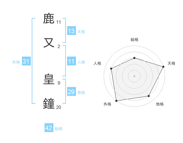 鹿又 皇鐘さんを姓名の画数から五運を鑑定