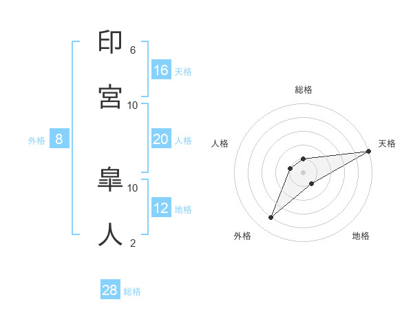 印宮 皐人さんの総格は28画の1点!