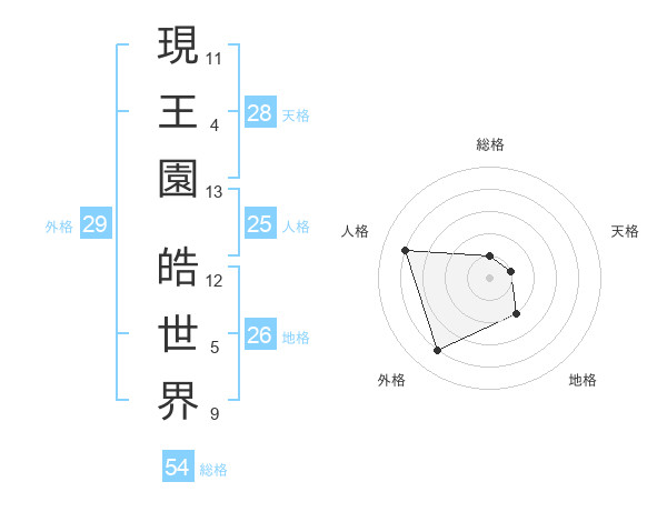 現王園 皓世界さんの総格は54画の1点