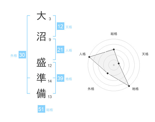 大沼 盛準備さんを姓名の画数から五運を鑑定