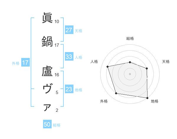 眞鍋 盧ヴァさんの総格は50画の2点!