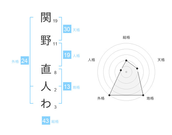 関野 直人わさんの総格は43画の2点!