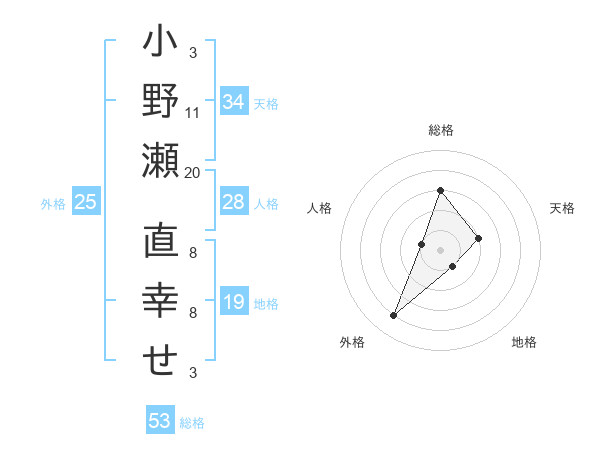 小野瀬 直幸せさんの総格は53画の3点!