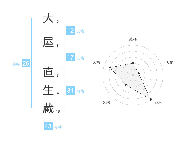 大屋 直生蔵さんを姓名の画数から五運を鑑定