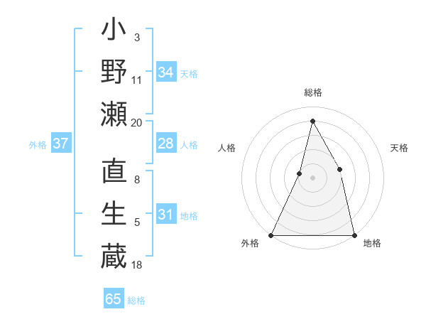 小野瀬 直生蔵さんの総格は65画の4点!