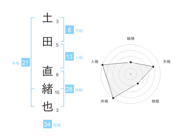 土田 直緒也さんの総格は34画の2点!