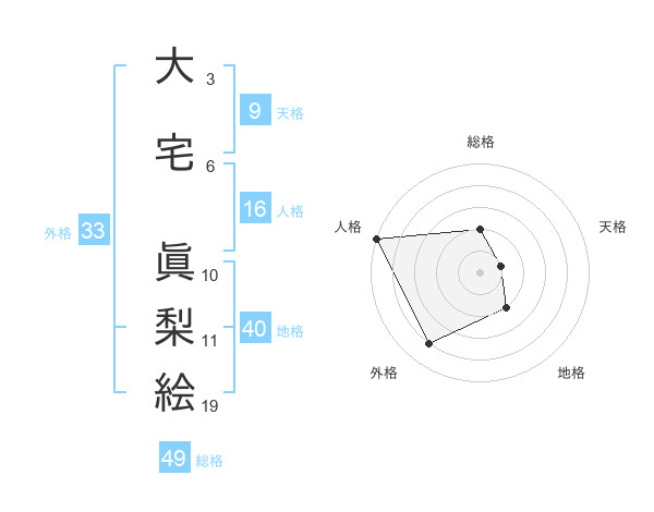 大宅 眞梨絵さんを姓名の画数から五運を鑑定