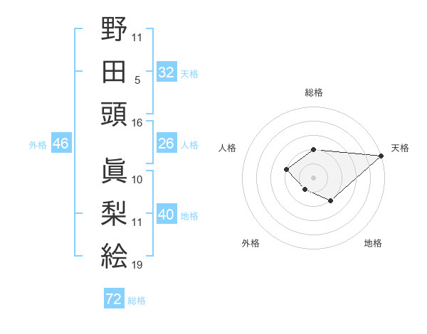 野田頭 眞梨絵さんを姓名の画数から五運を鑑定