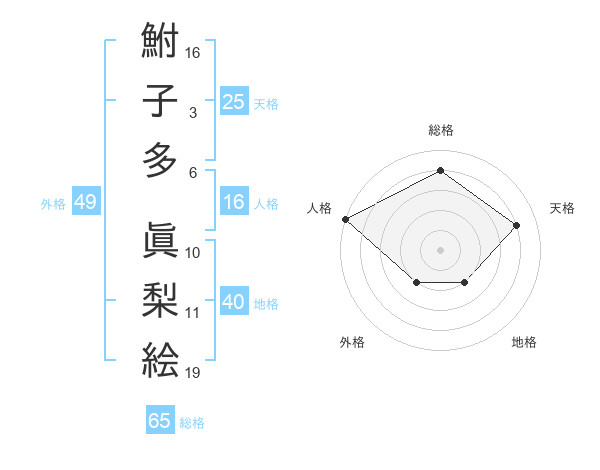 鮒子多 眞梨絵さんの総格は65画の4点!