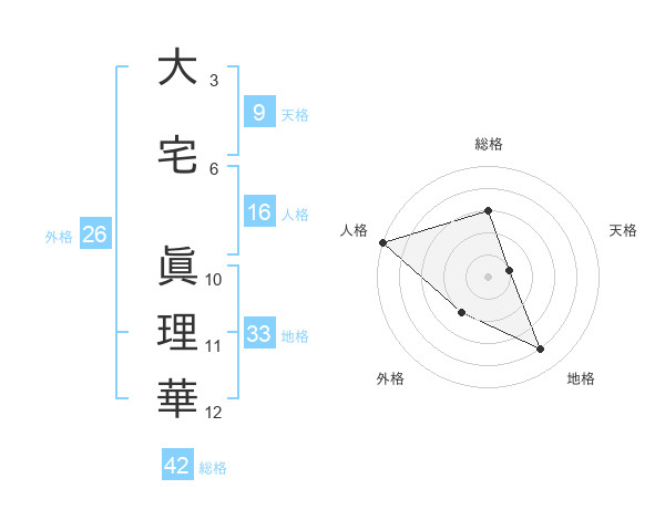 大宅 眞理華さんを姓名の画数から五運を鑑定
