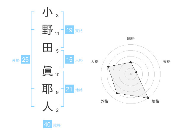小野田 眞耶人さんを姓名の画数から五運を鑑定