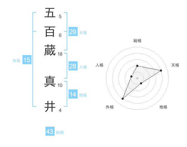 五百蔵 真井さんの総格は43画の2点!