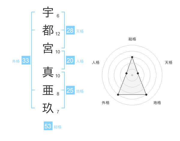 宇都宮 真亜玖さんの総格は53画の3点!