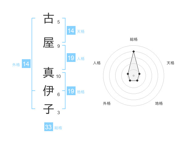 古屋 真伊子さんの総格は33画の4点!